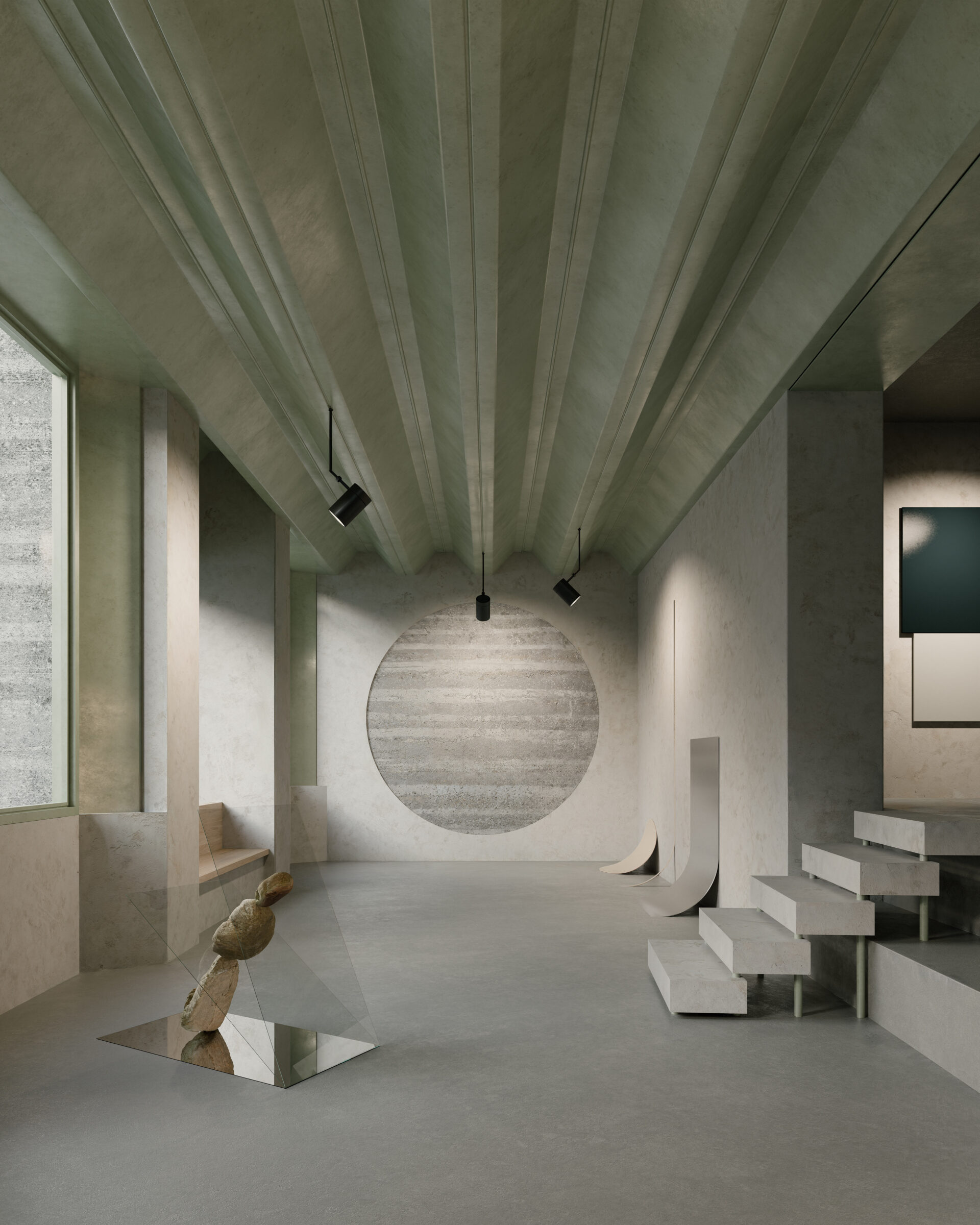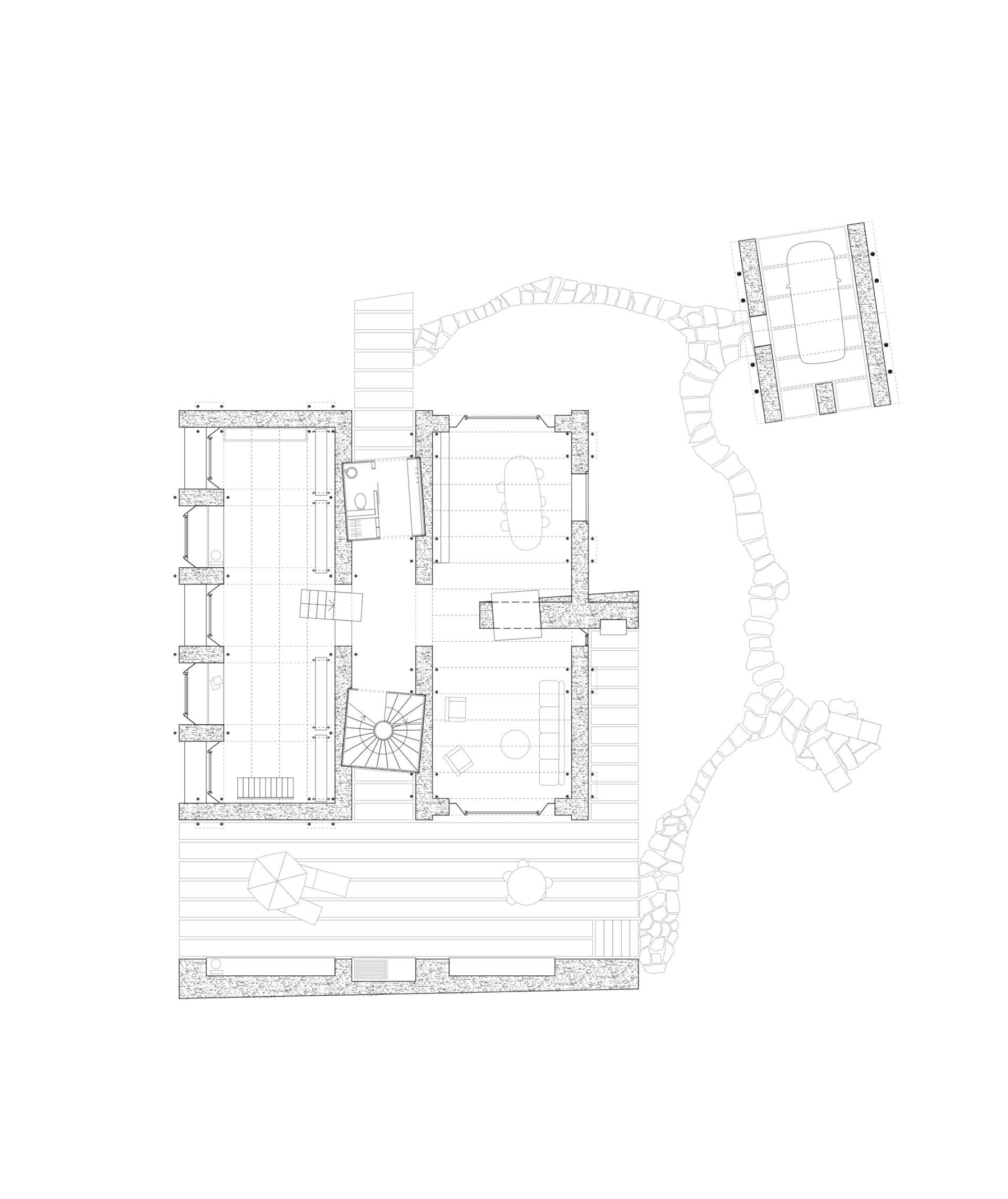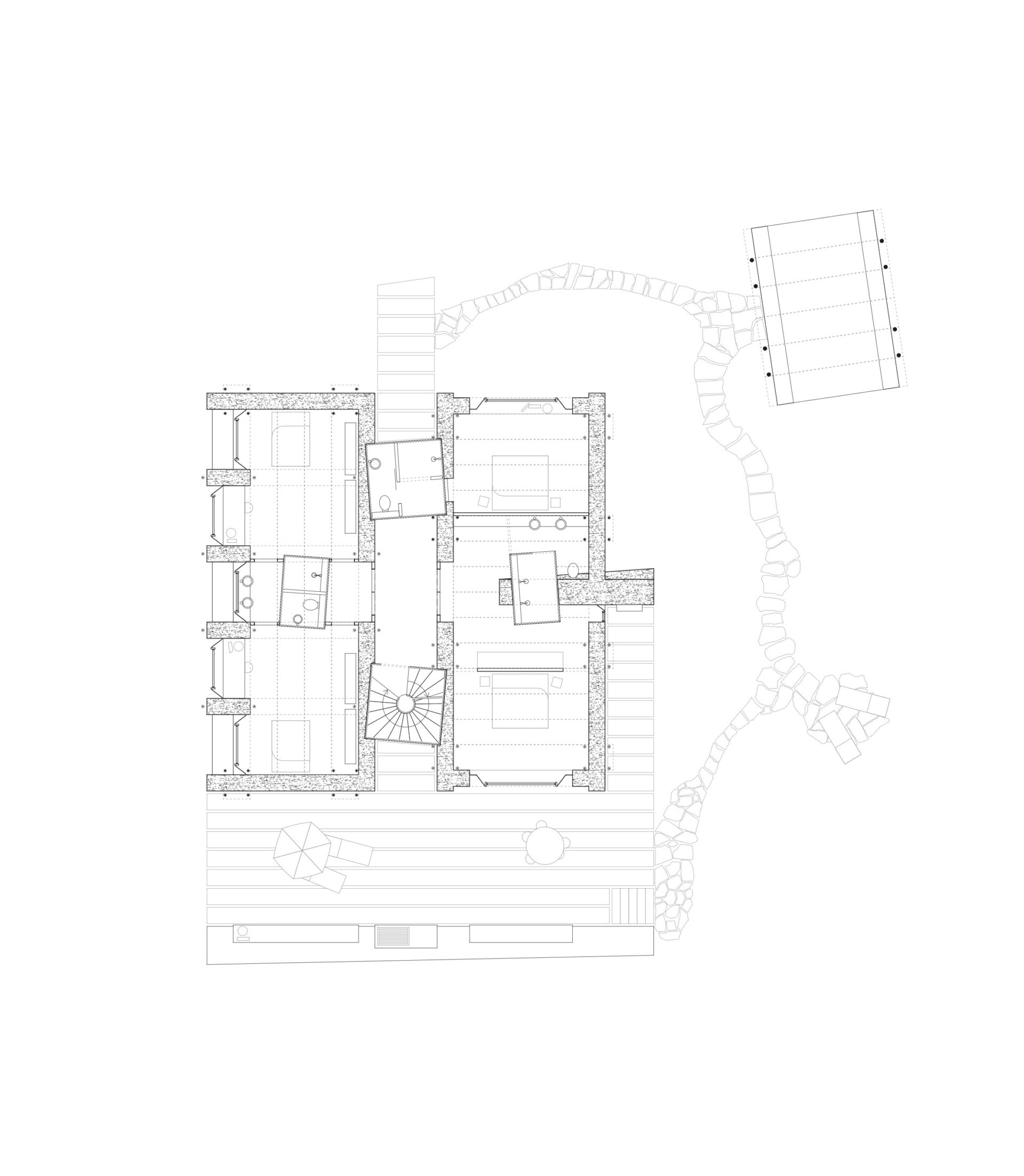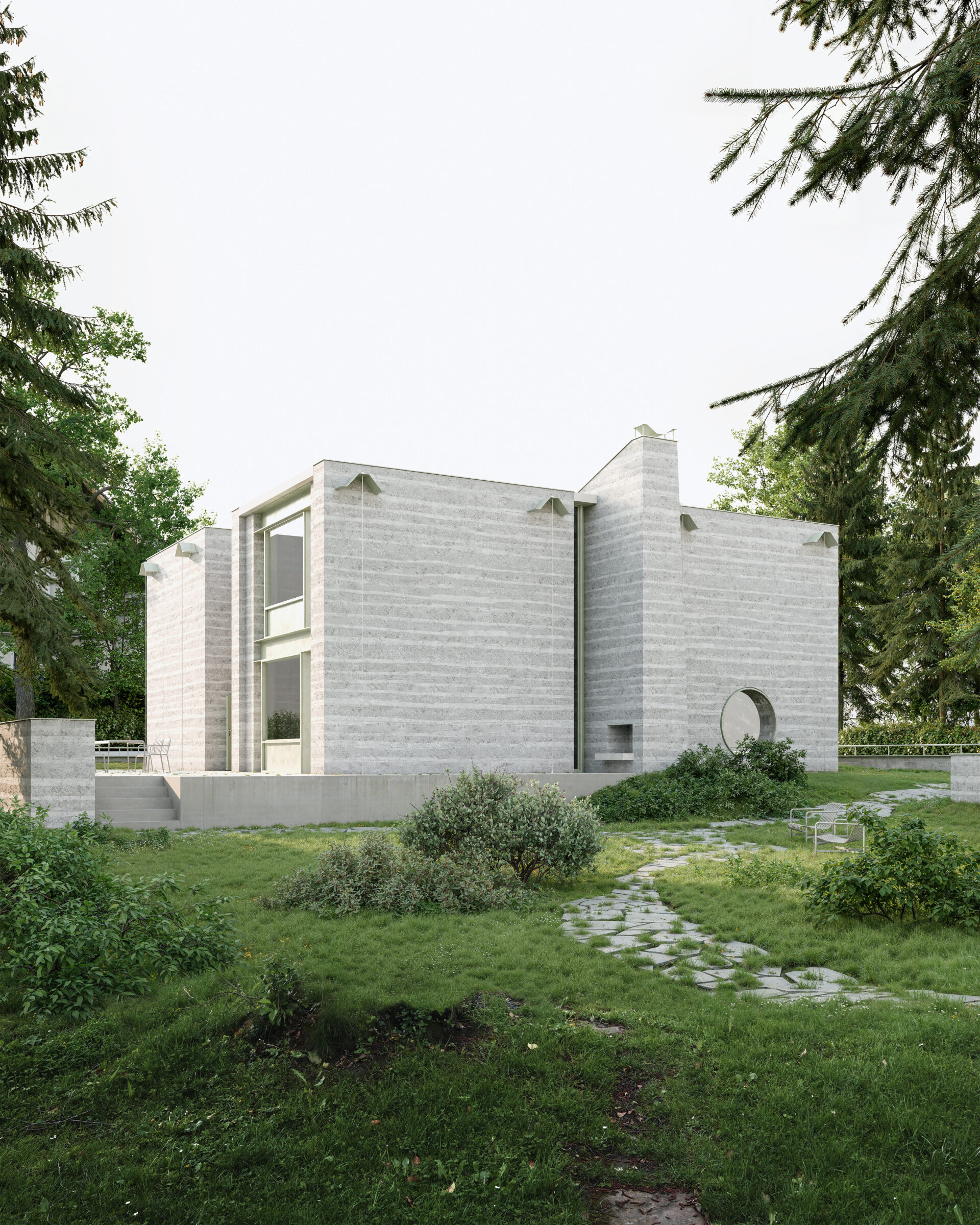 Experimentelles Lehmhaus 2023 – 2026 Experimental Earth House Bauherrschaft ClientPrivat privateTyp TypeNeubau, Wohnen New Construction, ResidentialOrt LocationWien WienStand StatusIn Planung In PlanningBaukosten BKP 1-9 Costs Bauherrschaft ClientPrivat privateTyp TypeNeubau, Wohnen New Construction, ResidentialOrt LocationWien WienStand StatusIn Planung In PlanningBaukosten BKP 1-9 Costs Das Experimentelle Lehmhaus wird als Ersatzneubau im 13. Wiener Bezirk als vorgespannte Lehm-Stahl-Hybridstruktur errichtet. Im Rahmen des Entwurfs wird eine innovative und dämmende Bauweise in Lehm angestrebt, in der Tragstruktur und Gebäudehülle monolithisch vereint werden. Das Projekt soll einen ambitionierten und interdisziplinären Beitrag zur Lehmbau-Forschung leisten. In unmittelbarer Nähe zur Werkbundsiedlung in Wien liegt das Eckgrundstück für das geplante Wohnhaus. Das bestehende dreigeschossige Gebäude (Unter-, Erd- und Obergeschoss) wird abgerissen, wobei die Ziegelsteine recycelt werden könnten. Zufahrt und Zugang erfolgen über die Seifertstrasse im Norden. Das Haus wird Nord-Süd-orientiert in einen baumreichen Garten eingebettet und fügt sich harmonisch in die Umgebung ein. Es müssen 13 neue Bäume gepflanzt werden. Terrasse und Garage erhalten Lehmsteine mit begrünten Fugen, um Versiegelung und Hitzebildung zu vermeiden. Eine Stampflehm-Stützmauer fasst die Terrasse ein. Die Garage wird als Lehm-Stahl-Hybridstruktur errichtet und dient Forschungszwecken für das Hauptgebäude. Die äussere Erscheinung des Neubaus wird durch die Dialektik von Lehm- und Stahlstruktur geprägt. Filigrane Stahlelemente kontrastieren mit der rauen Oberfläche des Stampflehms. Trag- und Fassadenelemente sind sichtbar und raumbildend. Böden aus Lehm-Terrazzo und Stampflehmwände schaffen eine warme Atmosphäre. Spundwand-Decken erzeugen eine reliefierte Untersicht, Vorspannungen sind sichtbar. Metallische Elemente sind grün eingefärbt. Grosse Fenster sind festverglast mit opaken Lüftungsflügeln und aussenliegender Verschattung. Holzwerkstoff-Innentüren und die Küche tragen zur wohnlichen Atmosphäre bei. Nasszellen haben Leichtbau-Installationsvorwände und Fliesen. Die selbsttragende Stahl-Treppe steht im lichtdurchfluteten Erschliessungskörper. Mobiliar der Bibliothek passt zur Lehm-Stahl-Hybridkonstruktion. Kunstsammlung und Archiv im Untergeschoss erhalten natürliche Belichtung durch Glasbaustein-Oberlichter. Stampflehm-Vorsatzschalen vor den Stahlbetonwänden schaffen eine einheitliche Ästhetik, und im Schwimmbad dienen sie als Feuchtigkeitsschutz, wobei Pool-Wasser-Flächen gefliest werden. The experimental earth house is being constructed as a replacement building in Vienna’s 13th district as a prestressed earth-steel hybrid structure. The design aims to achieve an innovative and insulating construction method in earth, in which the load-bearing structure and building envelope are monolithically combined. The project is intended to make an ambitious and interdisciplinary contribution to earth building research. The corner plot for the planned residential building is located in the immediate vicinity of the Werkbund Estate in Vienna. The existing three-storey building (lower, ground and upper floors) will be demolished and the bricks could be recycled. Access will be via Seifertstrasse to the north. The house will be embedded in a tree-filled garden facing north-south and will blend harmoniously into the surroundings. 13 new trees will have to be planted. The terrace and garage will have earth bricks with greened joints to prevent sealing and heat build-up. A rammed earth retaining wall surrounds the terrace. The garage is built as an earth-steel hybrid structure and serves research purposes for the main building. The external appearance of the new building is characterized by the dialectic of earth and steel structure. Filigree steel elements contrast with the rough surface of the rammed earth. Load-bearing and facade elements are visible and create space. Earth terrazzo floors and rammed earth walls create a warm atmosphere. Sheet pile ceilings create a relief soffit, with visible prestressing. Metallic elements are colored green. Large windows are fixed glazed with opaque ventilation sashes and external shading. Wood-based interior doors and the kitchen contribute to the homely atmosphere. Wet rooms have lightweight installation partitions and tiles. The self-supporting steel staircase is located in the light-flooded circulation area. Library furniture matches the earth-steel hybrid construction. The art collection and archive in the basement receive natural light through glass block skylights. Rammed earth facing shells in front of the reinforced concrete walls create a uniform aesthetic, and in the swimming pool they serve as moisture protection, with pool water surfaces being tiled.
