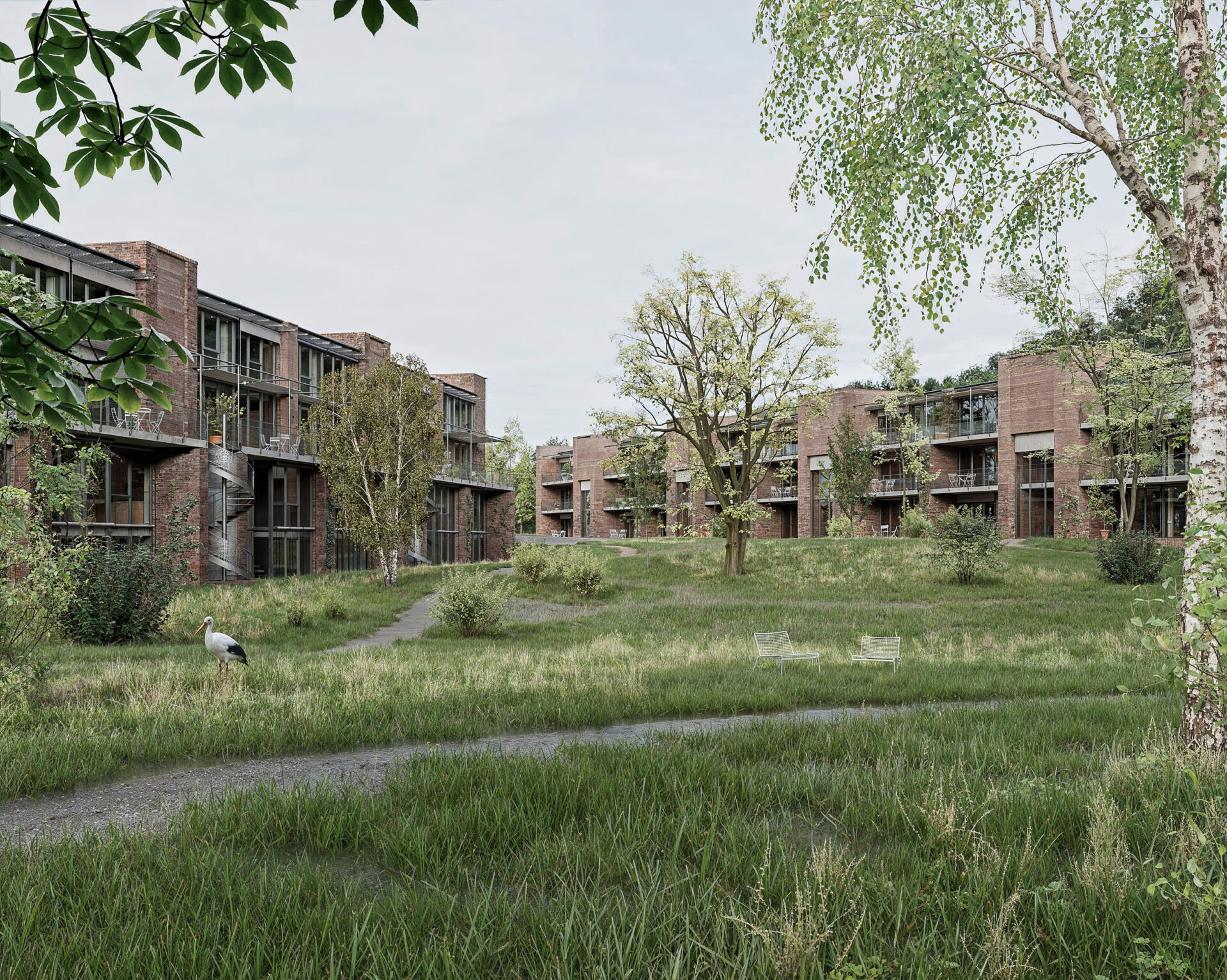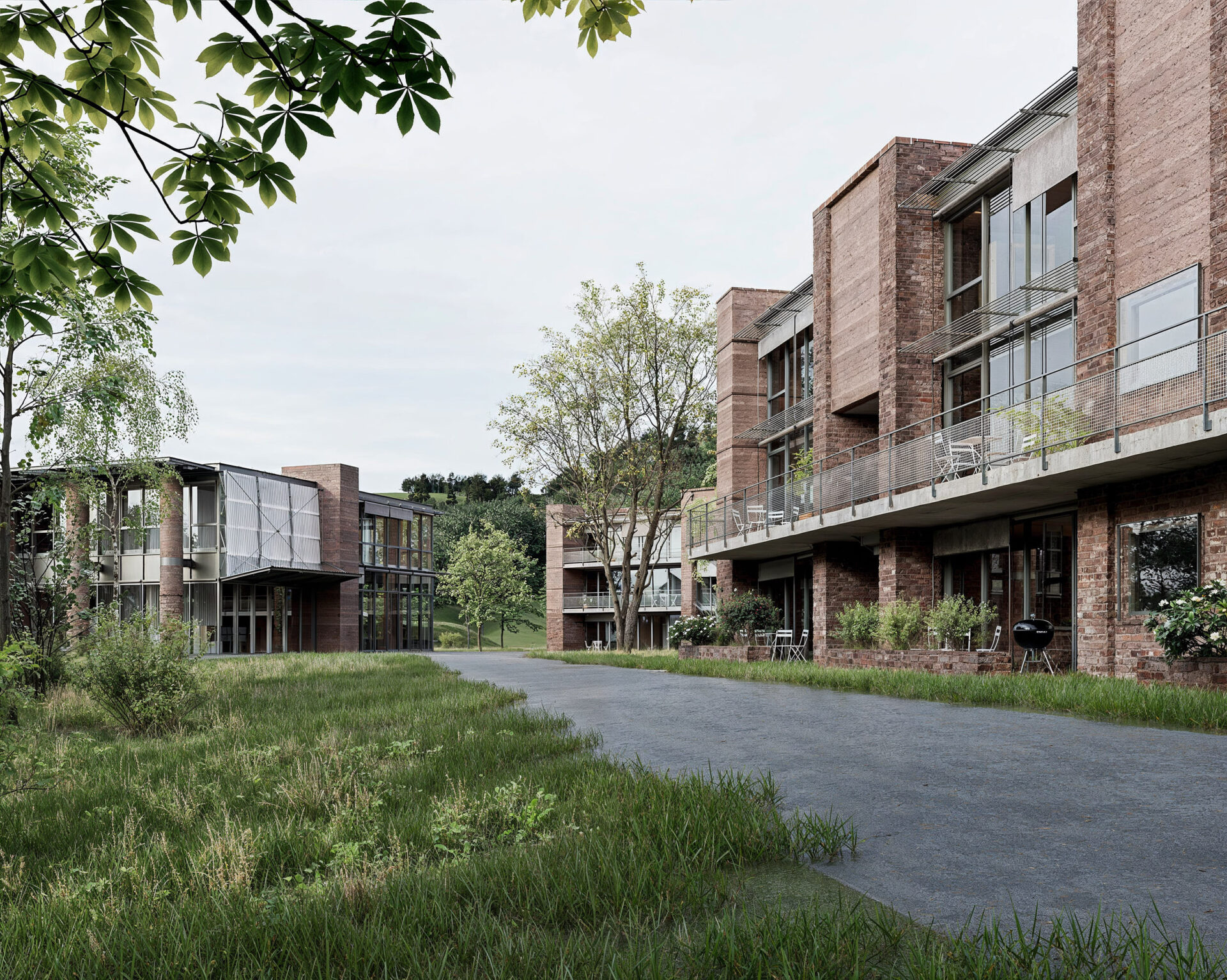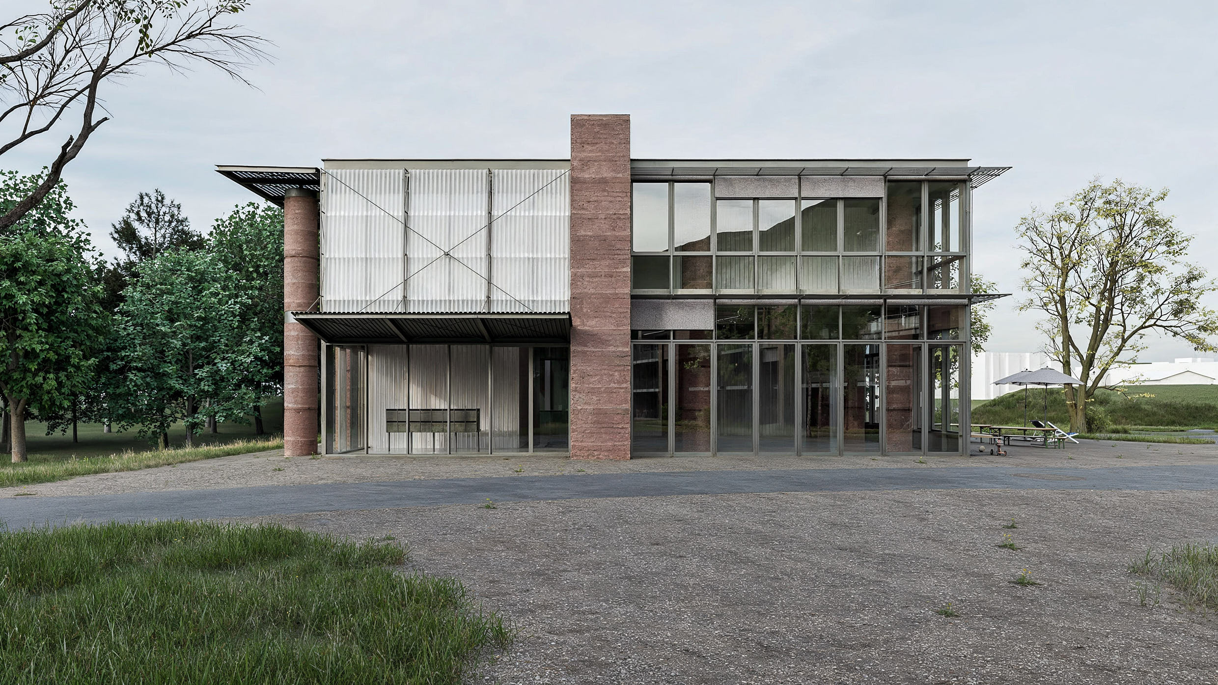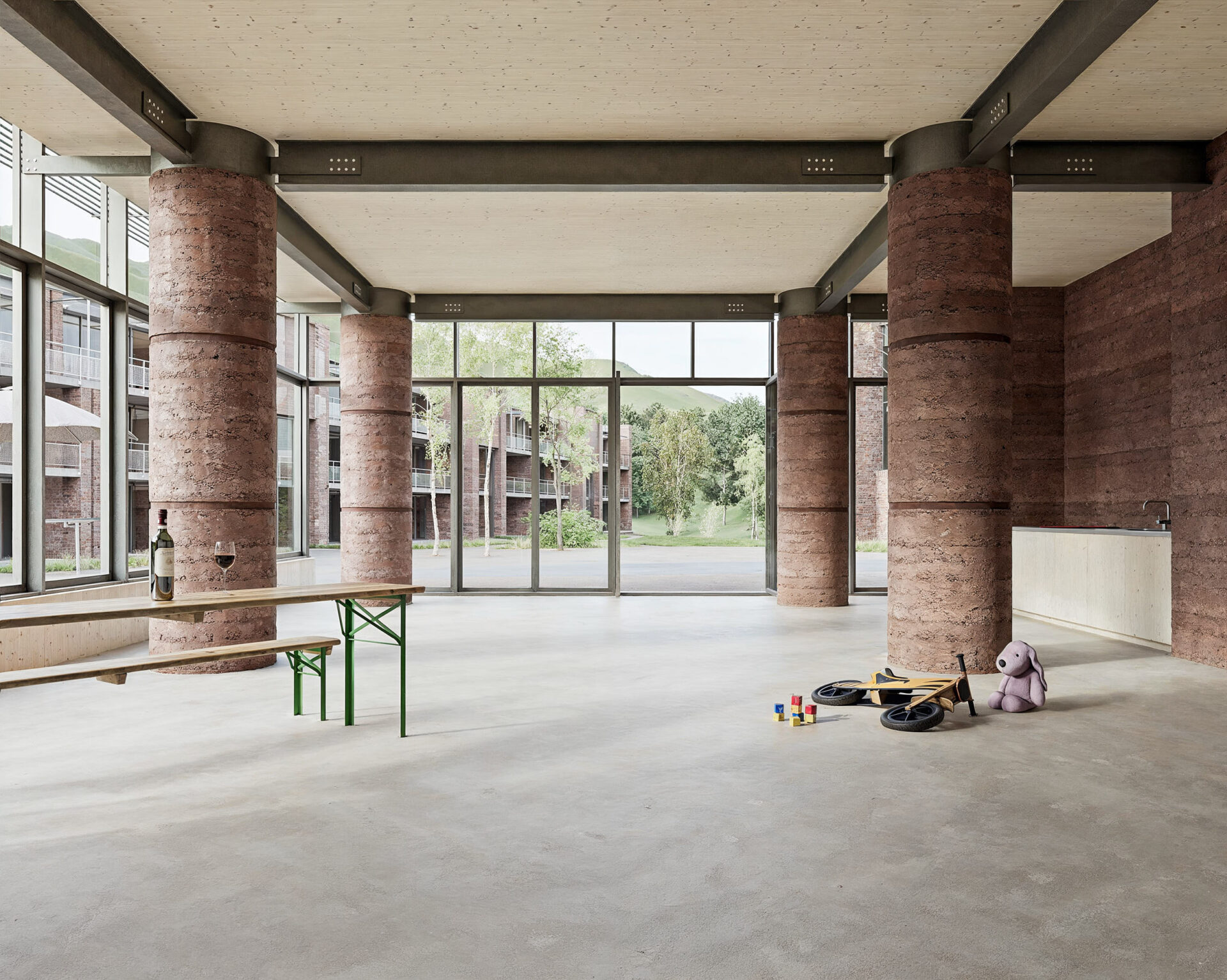 Ziegelei Areal Dättnau 2024 – 2026 Brickworks Dättnau Bauherrschaft ClientKeller AG Ziegeleien Keller AG ZiegeleienTyp TypeNeubau, Wohnen New Construction, ResidentialOrt LocationDättnau DättnauStand StatusWettbewerb Competition Studienauftrag, 1. Preis Ein Tal, vernässte Landschaft, im Boden eine Sperrschicht: Die Dättnauer Lehmplatte. Grund für den Bau der Ziegelei 1896. Mit ihr wächst auch Dättnau, beliebtes Quartier Winterthurs. Im Südwesten eine Wiese, Bauplatz für die letzte Etappe der neuen Siedlung, die anstelle der 2015 abgebrannten Ziegelei entsteht.Neubauten, die ein Erbe antreten; verformte Landschaft, rationelle Prozesse, Industrieanlagen wörtlich wie sinnbildlich mit hohem Schornstein.Das Wasser versickert hier schlecht, will bleiben, nährt eine revitalisierte wechselfeuchte Aue. Den lehmigen Grund nicht nur als Materialressource, sondern auch in dieser Hinsicht als Grundlage anzunehmen, führt zur Setzung der Häuser an den Rändern, parallel zu Bach und Waldrand. In ihrer Mitte darf sich die Aue unreguliert ausbreiten. Zwei laterale Wohnbauten, ein Pavillon als Mittler und Treffpunkt.Langhäuser und Naturräume stehen im Wechsel: Allmend – Gartenwohnen – Aue – Waldwohnen – Wald. Alle Wohnungen sind beidseitig orientiert und werden von unterschiedlichen Landschaftseindrücken bereichert. Von der Aue her bilden die beiden 80m langen Wohnzeilen den Auftakt zur Siedlung. Prägnant markieren die Kopffassaden die Grenze zum Naturraum, mehrdeutig in ihrer Sprache: Lehmwände, rezyklierter Backstein, Kamine und Stahlfenster – postindustrielle, erdgebundene Erinnerung an das, was vorher war, Verbindung mit der bestehenden und zukünftigen Landschaft. Die filigraneren Längsfassaden werden durch massive, monolithisch wirkende Baukörper rhythmisiert. Feine Details wie schlanke Stahlfenster und Geländer, strukturierte Pergolen und textile Markisen setzen einen leichten Kontrapunkt. Sorgfältig gestaltete Eingangsbereiche und nuancierte Übergänge von Aussen nach Innen tragen unterschiedlichen Bedürfnissen nach Kontakt und Privatheit Rechnung.Die Keller Unternehmungen als Eigentümerin mit Sitz im benachbarten Pfungen bietet selbst Hand für die Entwicklung einer Produktpalette ungebrannter Erdbaustoffe: Stampflehmelemente, mit Hilfe von Robotik hergestellt, Presslehmsteine, Aufbereitung von Recycling-Ziegeln. Sich der Endlichkeit ihrer Ressource und der ökologischen Nachteile gebrannter Ziegel bewusst, wird sie ihr Fachwissen und ihre Produktionskapazitäten mit modernsten Fertigungsmethoden zukünftig vermehrt in den Dienst nachhaltiger Produkte zu stellen. Dättnau IV wird auch zur gebauten Case Study eines zukunftsweisenden Angebots.In diesem Sinn wird Kosten und Risiken mit einem abgestuften Konstruktionskonzept begegnet. Nicht alles Neue wird gleich flächendeckend angewandt, sondern in bewusst ausgewählten Elementen getestet. GartenwohnenIm dreigeschossigen Baukörper zwischen Allmend und Binnenaue liegen 16 Maisonettewohnungen im Eigentum, die unteren mit Souterrain und Ausgang direkt in die Aue, die oberen von einer offenen Treppenfigur erschlossen sowie Wendeltreppen, die von den Terrassen direkt wieder hinunter in die Aue führen. Die informelle Durchwegung verbindet Menschen wie Naturräume und erinnert an das individuelle und doch sehr nachbarschaftliche Wohnen einer Reihenhaussiedlung. Es wird ein pragmatischer Ansatz mit bekannter Zweischalenkonstruktion und vertrauten Materialien verfolgt – unterlegt mit dem Anspruch, die Bauteile in ihrer Herstellung nach ökologischen Aspekten zu untersuchen. Trasskalk, CO₂-angereicherter Recyclingbeton sowie Reuse-Klinker kommen zum Einsatz. Wenn die Klinkerfassade unter dem Aspekt der Ökobilanz betrachtet wird, zeigt sich: Bei einem zweischaligen Aufbau lassen sich rund 56 % der Treibhausgas-Emissionen einsparen (1.703 statt 3.851 kg CO₂-eq/m²BauteilJahr), wenn statt herkömmlicher Materialien rezyklierte eingesetzt werden. Waldwohnen Der tiefe Baukörper klärt den Übergang zwischen Siedlung und Wald. Die 24 Mietwohnungen sind quer zur Tragstruktur in drei Raumschichten gegliedert. Vom zentralen Eingangsbereich öffnet sich der Blick in die offene Küche, die sich auf beide Seiten zu den Wohnräumen erweitert – Wohnen von Fassade zu Fassade. Der tiefe Blick in den Wald wird inszeniert, die oberen Wohnungen mit einem überhöhten Raum bieten einen Ausblick in die Baumkronen. Hier werden im Rahmen eines Pilotprojekts ausgewählte Bauteile wie die Treppenhäuser und die Stirnfassaden mit Kamin mit innovativen Bauweisen entwickelt. Die Schotten als primäre Tragstruktur werden vollständig monolithisch ausgeführt, massive Mauern aus Reuse-Klinker im Erdgeschoss bilden das tragende Fundament für die in den oberen Geschossen eingesetzten Stampflehmelemente. Die Stirnwände aus Lehm werden von innen gedämmt und übernehmen zugleich die Funktion als Deckenauflager. Der Anschluss erfolgt über eine Ankerplatte und einen im Lehmelement integrierten Ringanker, der zudem das präzise Einsetzen der werkseitig vorgefertigten Elemente ermöglicht. Für die grösseren Spannweiten zwischen Schotten und Treppenhäusern wird eine Sekundärtragstruktur aus filigranen Holzstützen mit Holzrippendecken eingesetzt. Der monolithische Stampflehm-Aufbau an der Kopffassade spart rund 60 % Treibhausgas-Emissionen gegenüber der zweischaligen Trasskalkfassade im Gartenwohnen (0.750 statt 1.890 kg CO₂-eq/m²BauteilJahr). PavillonDer Pavillon als Quartiertreff liegt, umgeben von einem Kiesplatz, im Schatten von Silberweiden und Zitterpappeln. Im Erdgeschoss sind der Zugang zu Veloraum und Tiefgarage, Briefkästen und Recyclingstation, sowie ein Gemeinschaftsraum untergebracht, im Obergeschoss Ateliers. Der Gemeinschaftsraum mit seiner prägnanten Lehmsäulen-Halle lässt sich durch vollständig öffenbare Fenster auf den Platz hinaus erweitern. Beim Pavillon steht ökologische Innovation im Vordergrund. Monolithisc
