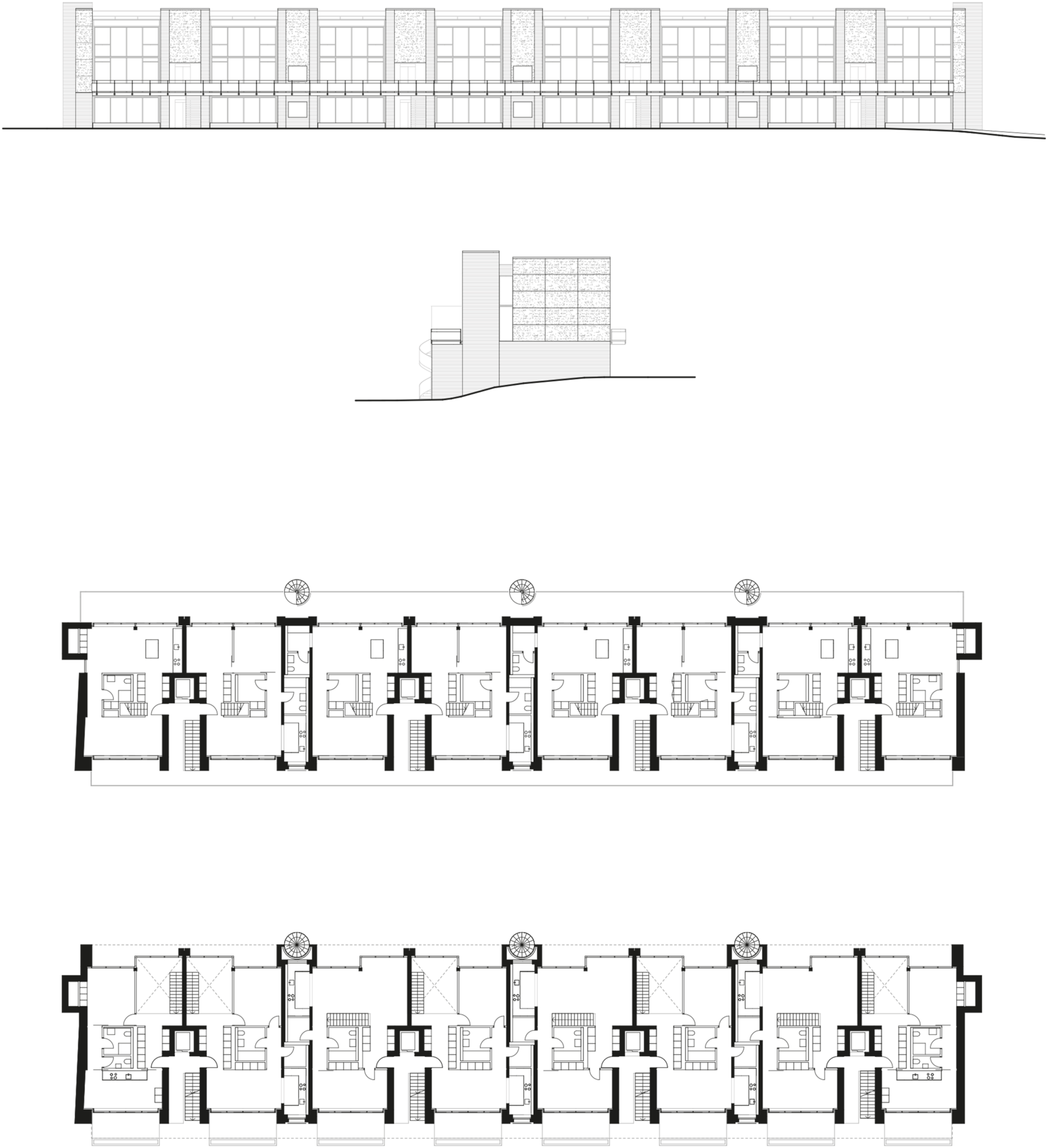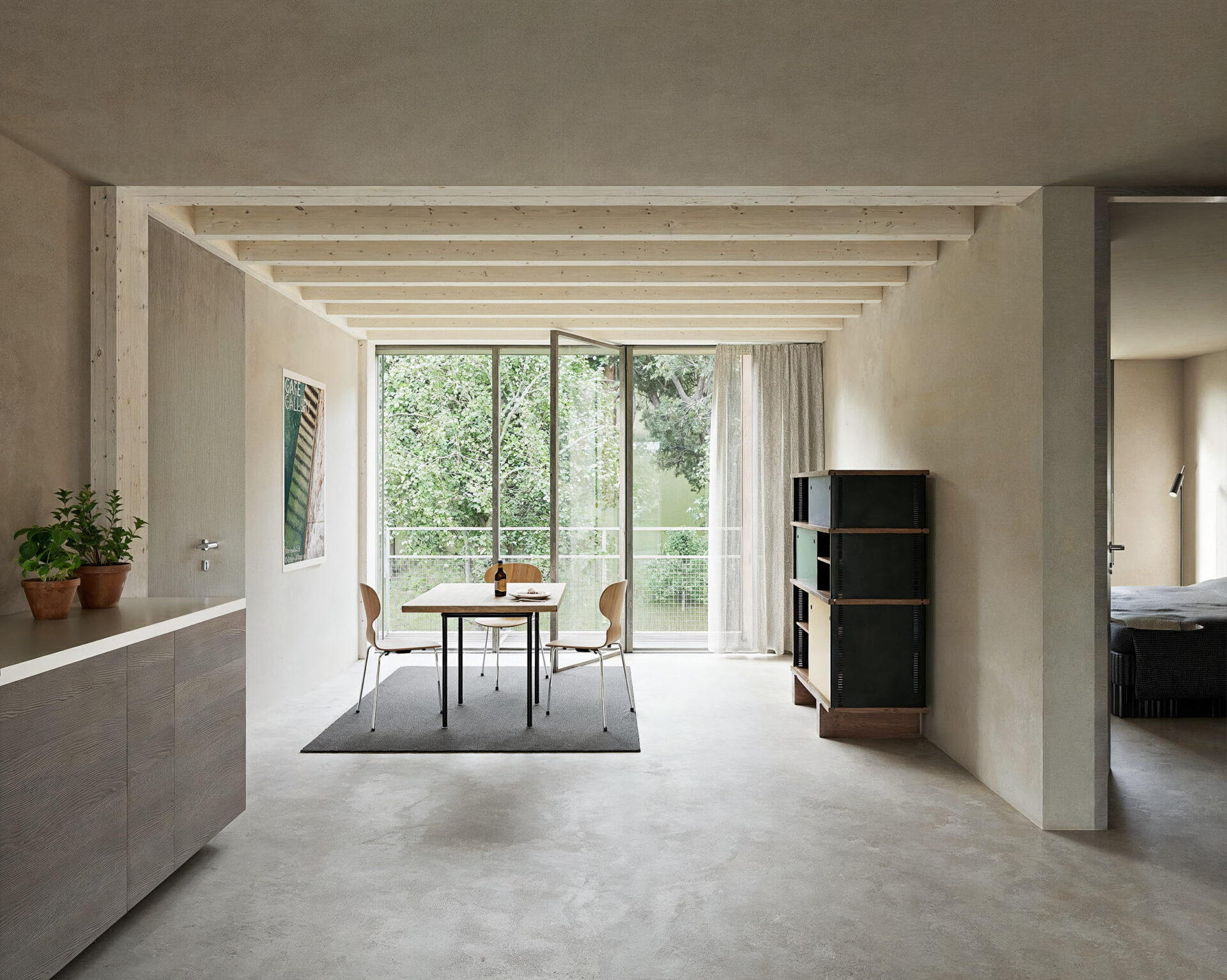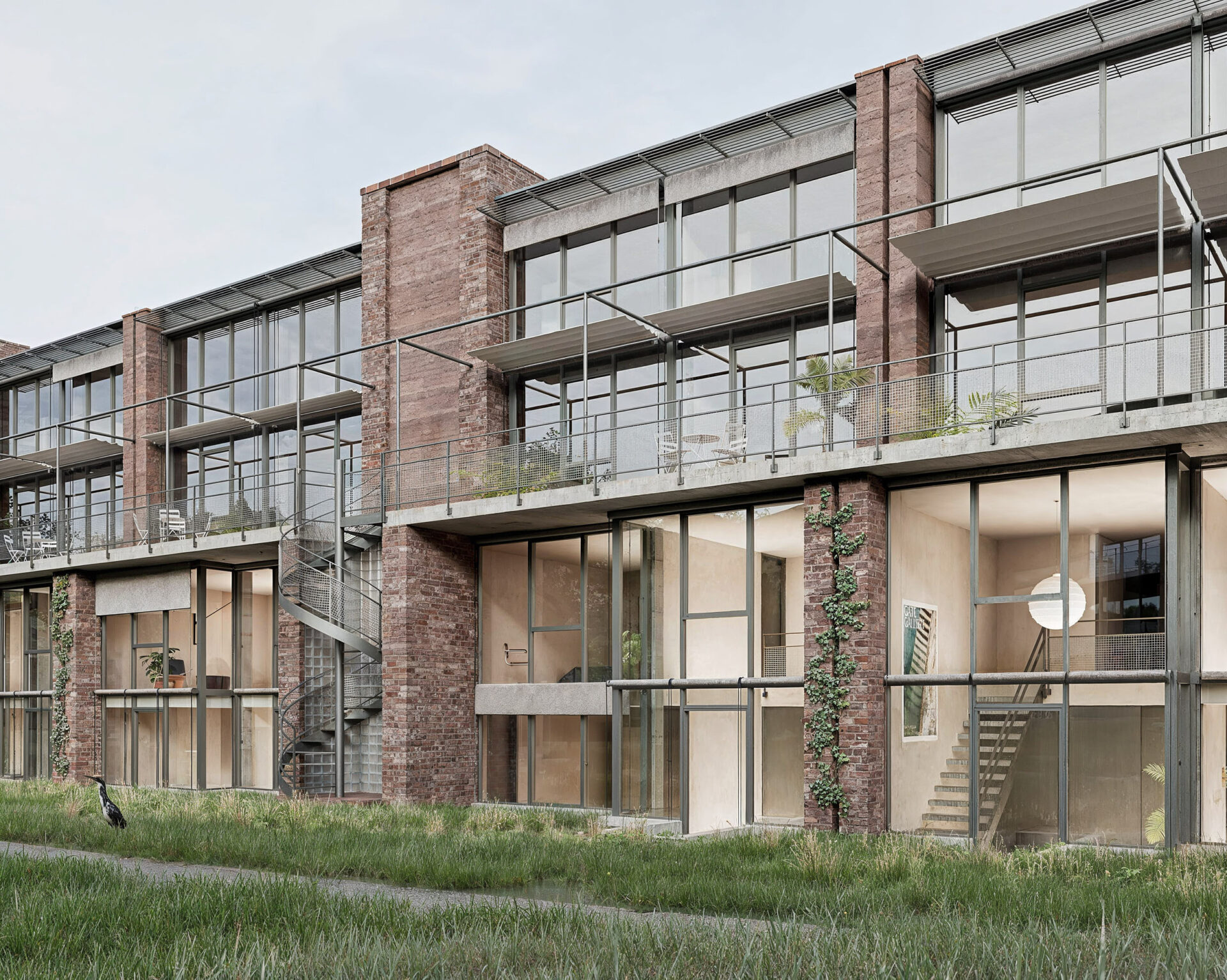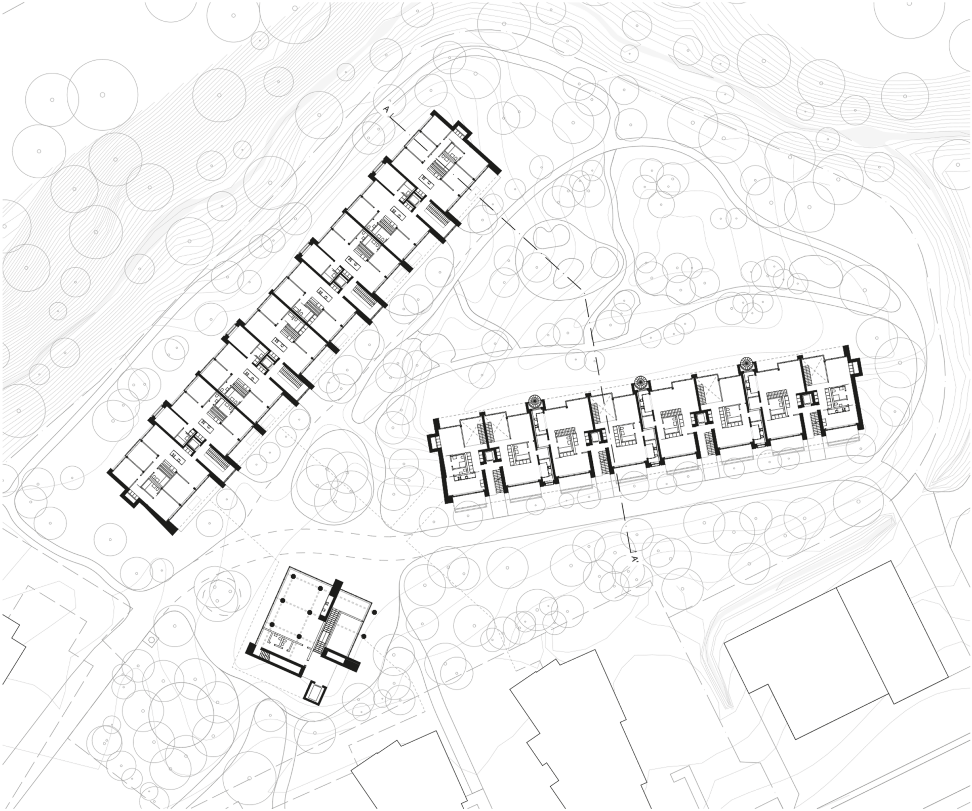 Ziegelei Areal Dättnau 2024 – 2026 Brickworks Dättnau Bauherrschaft ClientKeller AG Ziegeleien Keller AG ZiegeleienTyp TypeNeubau, Wohnen New Construction, ResidentialOrt LocationDättnau DättnauStand StatusWettbewerb Competition Studienauftrag, 1. Preis Ein Tal, vernässte Landschaft, im Boden eine Sperrschicht: Die Dättnauer Lehmplatte. Grund für den Bau der Ziegelei 1896. Mit ihr wächst auch Dättnau, beliebtes Quartier Winterthurs. Im Südwesten eine Wiese, Bauplatz für die letzte Etappe der neuen Siedlung, die anstelle der 2015 abgebrannten Ziegelei entsteht.Neubauten, die ein Erbe antreten; verformte Landschaft, rationelle Prozesse, Industrieanlagen wörtlich wie sinnbildlich mit hohem Schornstein.Das Wasser versickert hier schlecht, will bleiben, nährt eine revitalisierte wechselfeuchte Aue. Den lehmigen Grund nicht nur als Materialressource, sondern auch in dieser Hinsicht als Grundlage anzunehmen, führt zur Setzung der Häuser an den Rändern, parallel zu Bach und Waldrand. In ihrer Mitte darf sich die Aue unreguliert ausbreiten. Zwei laterale Wohnbauten, ein Pavillon als Mittler und Treffpunkt.Langhäuser und Naturräume stehen im Wechsel: Allmend – Gartenwohnen – Aue – Waldwohnen – Wald. Alle Wohnungen sind beidseitig orientiert und werden von unterschiedlichen Landschaftseindrücken bereichert. Von der Aue her bilden die beiden 80m langen Wohnzeilen den Auftakt zur Siedlung. Prägnant markieren die Kopffassaden die Grenze zum Naturraum, mehrdeutig in ihrer Sprache: Lehmwände, rezyklierter Backstein, Kamine und Stahlfenster – postindustrielle, erdgebundene Erinnerung an das, was vorher war, Verbindung mit der bestehenden und zukünftigen Landschaft. Die filigraneren Längsfassaden werden durch massive, monolithisch wirkende Baukörper rhythmisiert. Feine Details wie schlanke Stahlfenster und Geländer, strukturierte Pergolen und textile Markisen setzen einen leichten Kontrapunkt. Sorgfältig gestaltete Eingangsbereiche und nuancierte Übergänge von Aussen nach Innen tragen unterschiedlichen Bedürfnissen nach Kontakt und Privatheit Rechnung.Die Keller Unternehmungen als Eigentümerin mit Sitz im benachbarten Pfungen bietet selbst Hand für die Entwicklung einer Produktpalette ungebrannter Erdbaustoffe: Stampflehmelemente, mit Hilfe von Robotik hergestellt, Presslehmsteine, Aufbereitung von Recycling-Ziegeln. Sich der Endlichkeit ihrer Ressource und der ökologischen Nachteile gebrannter Ziegel bewusst, wird sie ihr Fachwissen und ihre Produktionskapazitäten mit modernsten Fertigungsmethoden zukünftig vermehrt in den Dienst nachhaltiger Produkte zu stellen. Dättnau IV wird auch zur gebauten Case Study eines zukunftsweisenden Angebots.In diesem Sinn wird Kosten und Risiken mit einem abgestuften Konstruktionskonzept begegnet. Nicht alles Neue wird gleich flächendeckend angewandt, sondern in bewusst ausgewählten Elementen getestet. GartenwohnenIm dreigeschossigen Baukörper zwischen Allmend und Binnenaue liegen 16 Maisonettewohnungen im Eigentum, die unteren mit Souterrain und Ausgang direkt in die Aue, die oberen von einer offenen Treppenfigur erschlossen sowie Wendeltreppen, die von den Terrassen direkt wieder hinunter in die Aue führen. Die informelle Durchwegung verbindet Menschen wie Naturräume und erinnert an das individuelle und doch sehr nachbarschaftliche Wohnen einer Reihenhaussiedlung. Es wird ein pragmatischer Ansatz mit bekannter Zweischalenkonstruktion und vertrauten Materialien verfolgt – unterlegt mit dem Anspruch, die Bauteile in ihrer Herstellung nach ökologischen Aspekten zu untersuchen. Trasskalk, CO₂-angereicherter Recyclingbeton sowie Reuse-Klinker kommen zum Einsatz. Wenn die Klinkerfassade unter dem Aspekt der Ökobilanz betrachtet wird, zeigt sich: Bei einem zweischaligen Aufbau lassen sich rund 56 % der Treibhausgas-Emissionen einsparen (1.703 statt 3.851 kg CO₂-eq/m²BauteilJahr), wenn statt herkömmlicher Materialien rezyklierte eingesetzt werden. Waldwohnen Der tiefe Baukörper klärt den Übergang zwischen Siedlung und Wald. Die 24 Mietwohnungen sind quer zur Tragstruktur in drei Raumschichten gegliedert. Vom zentralen Eingangsbereich öffnet sich der Blick in die offene Küche, die sich auf beide Seiten zu den Wohnräumen erweitert – Wohnen von Fassade zu Fassade. Der tiefe Blick in den Wald wird inszeniert, die oberen Wohnungen mit einem überhöhten Raum bieten einen Ausblick in die Baumkronen. Hier werden im Rahmen eines Pilotprojekts ausgewählte Bauteile wie die Treppenhäuser und die Stirnfassaden mit Kamin mit innovativen Bauweisen entwickelt. Die Schotten als primäre Tragstruktur werden vollständig monolithisch ausgeführt, massive Mauern aus Reuse-Klinker im Erdgeschoss bilden das tragende Fundament für die in den oberen Geschossen eingesetzten Stampflehmelemente. Die Stirnwände aus Lehm werden von innen gedämmt und übernehmen zugleich die Funktion als Deckenauflager. Der Anschluss erfolgt über eine Ankerplatte und einen im Lehmelement integrierten Ringanker, der zudem das präzise Einsetzen der werkseitig vorgefertigten Elemente ermöglicht. Für die grösseren Spannweiten zwischen Schotten und Treppenhäusern wird eine Sekundärtragstruktur aus filigranen Holzstützen mit Holzrippendecken eingesetzt. Der monolithische Stampflehm-Aufbau an der Kopffassade spart rund 60 % Treibhausgas-Emissionen gegenüber der zweischaligen Trasskalkfassade im Gartenwohnen (0.750 statt 1.890 kg CO₂-eq/m²BauteilJahr). PavillonDer Pavillon als Quartiertreff liegt, umgeben von einem Kiesplatz, im Schatten von Silberweiden und Zitterpappeln. Im Erdgeschoss sind der Zugang zu Veloraum und Tiefgarage, Briefkästen und Recyclingstation, sowie ein Gemeinschaftsraum untergebracht, im Obergeschoss Ateliers. Der Gemeinschaftsraum mit seiner prägnanten Lehmsäulen-Halle lässt sich durch vollständig öffenbare Fenster auf den Platz hinaus erweitern. Beim Pavillon steht ökologische Innovation im Vordergrund. Monolithisc